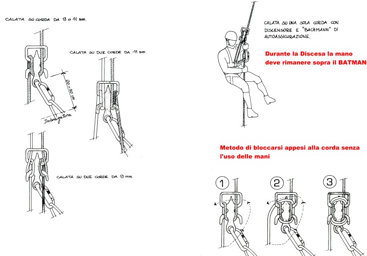 Il capocordata è meglio che scenda con una assicurazione alla corda tramite un cordino da 8 mm. e un nodo BATMAN legato direttamente all'imbragatura e a una distanza che consenta di poterlo trascinare o di poterlo allentare nel caso di bloccaggio.
