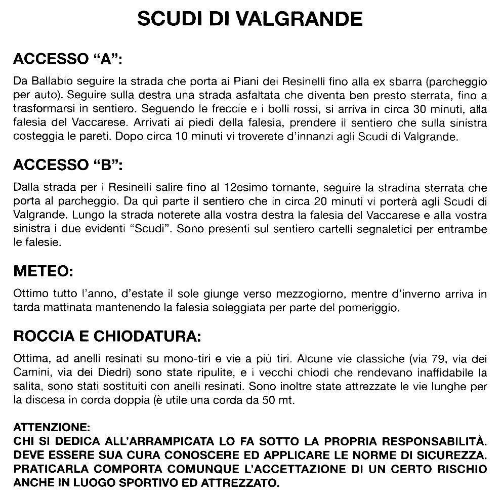 Una delle più importanti aree di arrampicata lombarde, frequenta, costituita dalla lunga fascia rocciosa che, a monte dello Zucco di Teral, sale verso i Resinelli sul fianco sinistro idrografico della Valgrande con la successione delle falesie del VACCARESE fino agli SCUDI DI VALGRANDE.